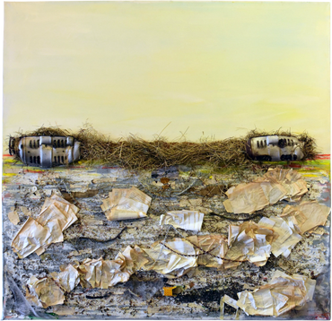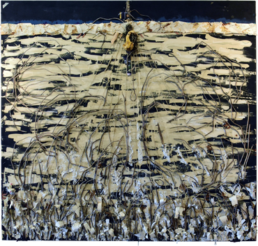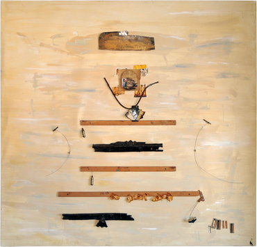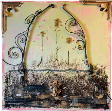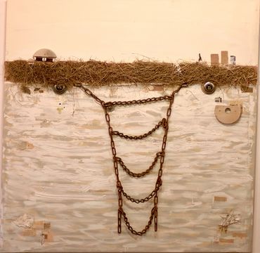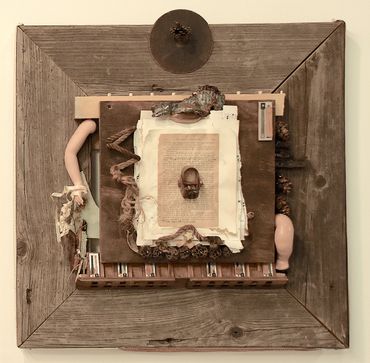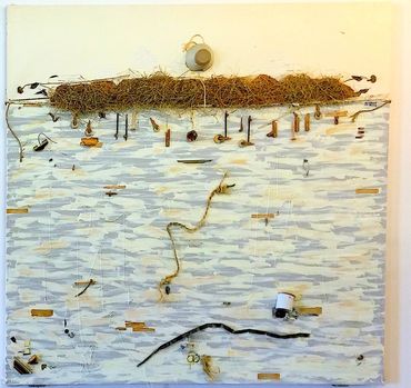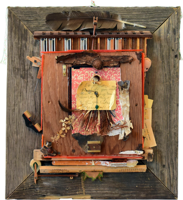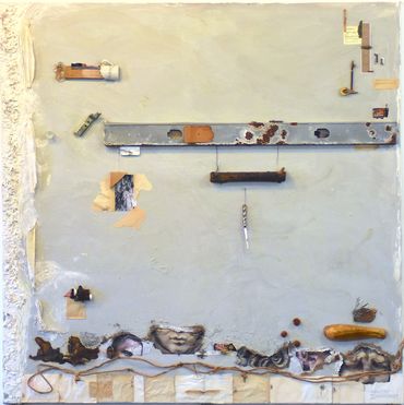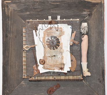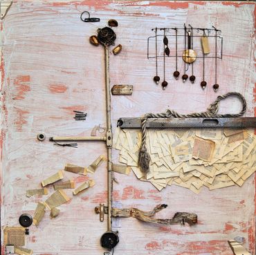 Wood, Metal, Canvas, Rope, Wire, Leather, Fabric, Housepaint, Windows, Book pages, Bark, Burl, Dry lemon rinds, Glass, Chalk, Carpet, Hay, Chains, Hooks, Cellar doors, Oak doors, Shutters, Wood Paneling, Squash, Linen, Plumbing pipe, Piano keys, Keys, Metal studs, Steamer trunks, Desk tools, Desiccated clementines, Clock parts, Car parts, Doll parts, Jewelry, Trowels, Twigs, Disassembled chairs, Utility covers, Fire hydrant tops, Fuzz, Shells, Leaves, Dry flowers, Rollers, Razors, Mattress springs, Mango pits, Poetry stanzas, Accordions, Toys, Tulle, Tacks, Fur, Broken frames, Turtle shell, Vegetable stems, Sink parts, Dials, Pulleys, Brackets, Beads, Bugs, Exotic plant specimens, Flattened lizards, May & Jesus, Tiny bird bones, Postage stamps, Moss, Dry tea, Corks, Ceramics, Coat racks, Soap dishes, Rusted anything, Most anything burned, One half-smoked cigar, and a few other bits of engaging detritus.