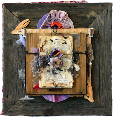 burnt book pages, bark, printed images, key, leather tag, branches, straw